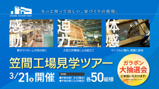 3/21(土)に笠間市で開催する木質系住宅の工場見学会です。生産ラインの真横を歩いてご見学いただける貴重な機会となります。ご参加をお待ちしております。