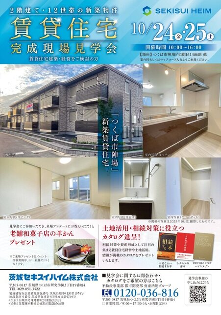2階建て・1LDK・12世帯の新築賃貸住宅をぜひご見学ください。 賃貸住宅建築・経営をご検討の方ご来場お待ちしております。