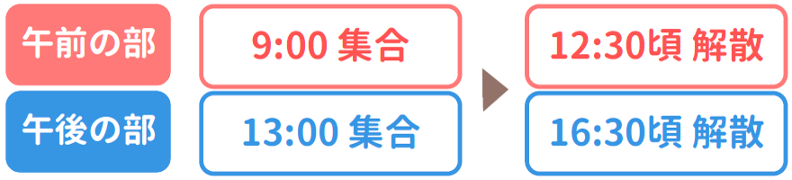 - (午前の部)9:00~12:30 (午後の部)13:00~16:30