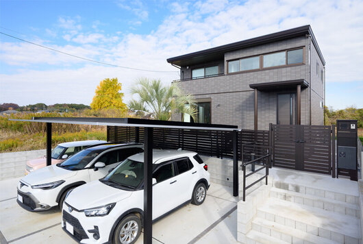結婚を機に住まいづくりを始められたT様ご夫婦。統一感のあるホテルライクな空間を目指し、モノトーンを基調とした上質な仕上がりの住宅に。パントリーや家事動線、収納、書斎等で生活感を感じさせない工夫が随所に見られます。ヤシの木をアクセントにしたお庭や高低差を生かした敷地はプライバシーも確保し、未来の暮らしにも寄り添うお家が完成しました。