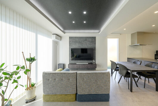 折り下げ天井の間接照明と石目のテレビボードが、まるでホテルラウンジのような雰囲気に。白×グレーの統一感ある配色で、生活感を抑えた洗練された空間に仕上がっています。