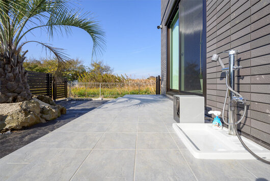 外と中のつながりを自然に感じられるタイルデッキは道路からの視線を遮り、人目を気にせずくつろげる開放的な場所。ヤシの木が揺れる景色と心地よい抜け感が、日常を少しだけホテルのようにしてくれます。