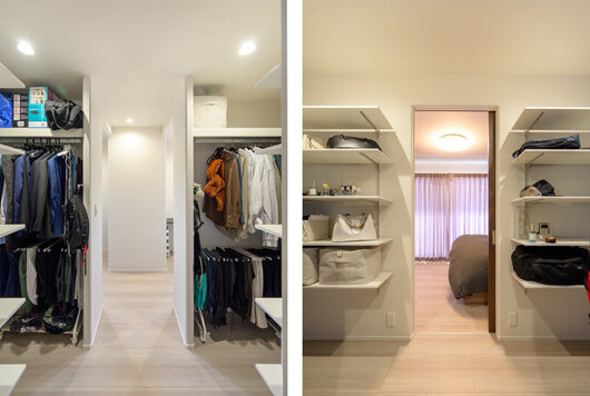 ご主人様、奥様でエリアを分けた収納は互いの動線が重ならずストレスフリー。棚やハンガーの高さも計算しました。衣類や小物がすっきり収まる生活感を感じさせない収納に。