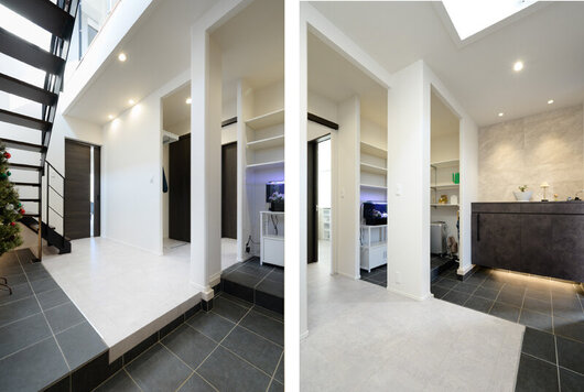差し込む光とタイル貼りで仕上げた玄関はホテルのような空間に。広めに設けた土間収納は靴やベビーカー、アウトドア用品までスマートに隠せ、生活感を抑えつつ将来の家族構成の変化にも対応できます。