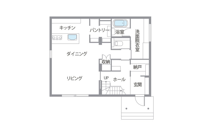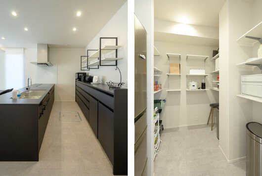 モノトーンでまとめたキッチンは、無駄をそぎ落としたデザインでホテルのような静けさが漂います。広いパントリーが生活感をしっかり隠し、毎日の家事をスムーズにしてくれる空間です。