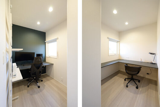 ご主人様、奥様それぞれに設けた個別書斎は、クローゼットの奥に配置しており仕事にも趣味にも没頭できる静かな場所。お互いの気配を感じつつも作業に集中できるちょうどいい距離感。在宅ワークの質がぐっと上がります。