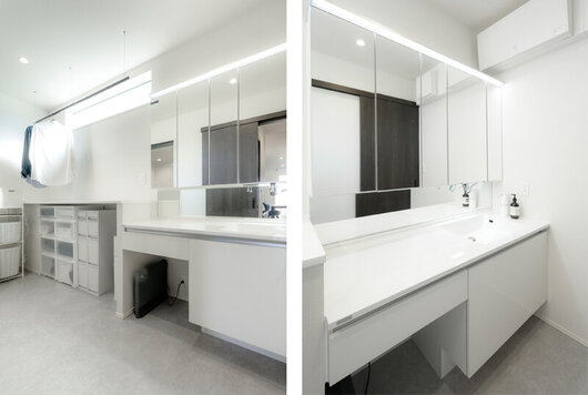 ホテルライクな白で統一した洗面は大きい三面鏡、広いカウンターで家事や身支度を同時にこなせます。大容量収納で日用品もすっきり収まる生活感を見せない洗面室です。