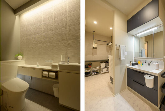 トイレはエコカラットの質感を引き立てるため、間接照明を丁寧に計画。家事動線の要としてストレスのない暮らしを支えている洗面は回遊できる位置に配置しました。