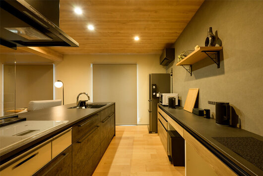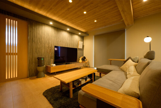 引っ越しを重ねてきた日々の先にT様が選んだのは「腰を据えて暮らせる自分の城」でした。和の温もりにモダンの要素を重ね、色数や素材を丁寧に絞り込んだ空間はどこにいても心が落ち着く佇まいに。家事や身支度を考えた動線、ペットの暮らしを考えた設備計画など目に見えない快適さにも心を配っています。暮らしに寄り添い続ける「自分の城」が完成しました。