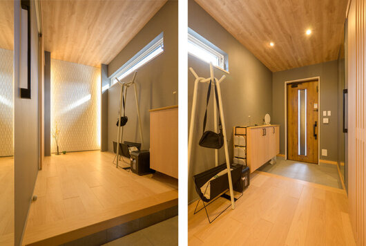 正面の一面に間接照明を採用しエコカラットの質感を丁寧に表現。お気に入りの陶器のために照明を計画し魅せる玄関をつくり上げました。