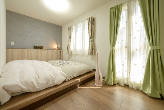 小上がりのベッドスペースを設けた主寝室。アクセントクロスを取り入れ、落ち着いてくつろげる空間に仕上げました。