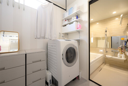 室内干しができるアイアンバーを設けた脱衣室。ベージュトーンでまとめた浴室とつながり、明るく使いやすい水まわり空間です。