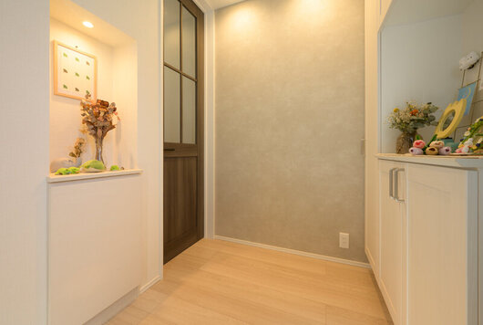 飾り棚のニッチが目を引くやさしい雰囲気の玄関。ハイドアを採用することで空間に広がりを感じられる設計です。