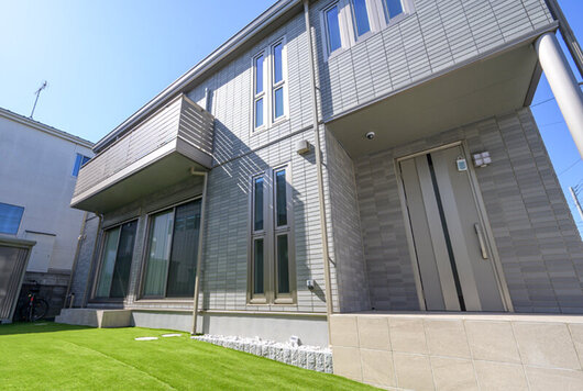 タイル外壁の美しい外観と、大きな窓から光を取り込む明るい住まい。広く確保した人工芝の庭は将来お子さまがのびのび遊べる家族の憩いの空間です。