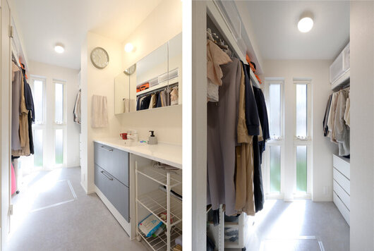 手洗いスペースとつながるファミリークローク。両側の収納と窓からの光で使いやすく明るい収納空間に仕上げました。