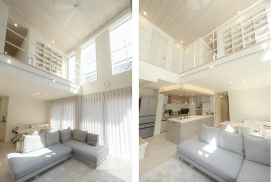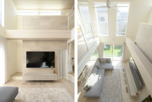 家族一番のお気に入りは吹き抜けと高窓から光が広がる明るいリビング。エコカラットのアクセントウォールが高級感を演出し、2階の通路が家族のつながりを生み出します。