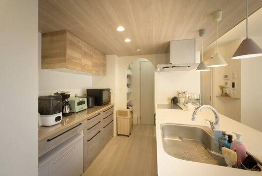 ベージュトーンでまとめた落ち着きのあるキッチン。下がり天井とアーチ型パントリーがやわらかで優しいキッチンを印象づけます。