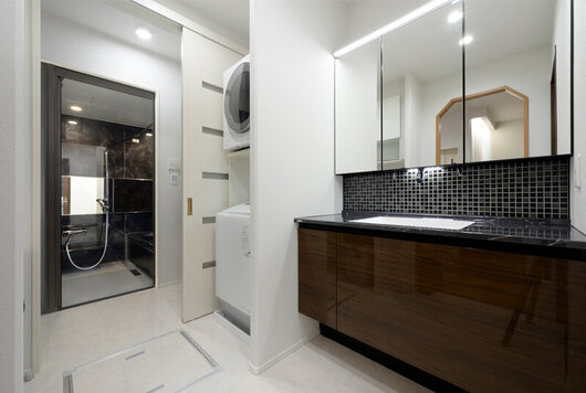 広めにとった使いやすい洗面、脱衣室は段差を抑えたバリアフリー設計で快適に利用できる空間です。