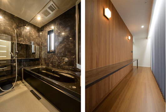 ゆとりある広さの浴室と使い方を選ばない2階のフレキシブルスペース。手すりやカウンターを設け、安心して使える設計と多目的に活用できる空間を両立しています。