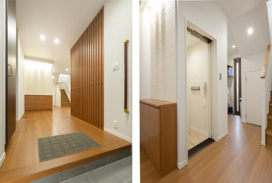 フラットな床と手すりで移動しやすい玄関空間。ホームエレベーターでバリアフリーな住まいです。