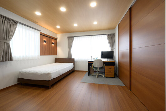 落ち着いた色合いでまとめた、ゆとりある寝室。全館空調により快適性は抜群でリモートワークでも苦にならない空間に仕上げました。