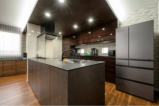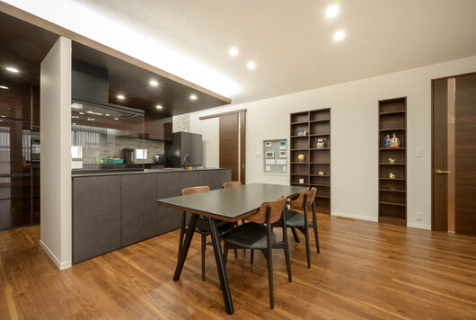 落ち着いた色合いでまとめた統一感のあるダイニングキッチン。壁面収納を設け、すっきりと使いやすい空間に仕上げました。