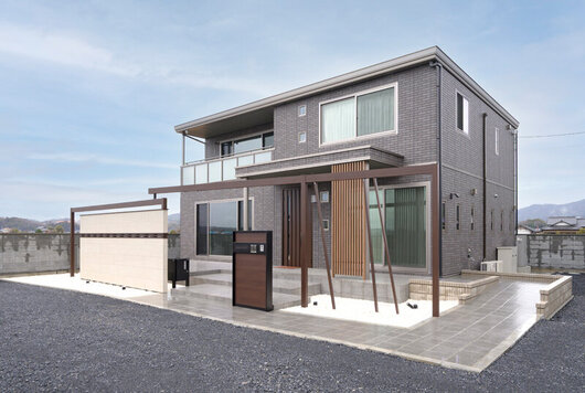 重厚感のあるタイル外壁が印象的な住まい。広く確保したアプローチとフラットな外構で、バリアフリーに配慮した設計です。
