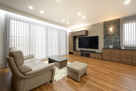 広さを重視した開放感あふれるリビング空間。大容量の収納を設けることでいつでも整った状態を保てる住まいです。