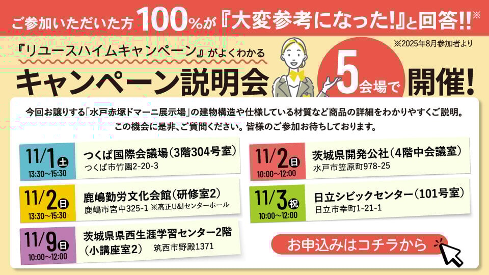 「リユースハイムキャンペーン」のお申込みフォーム内、『キャンペーン概要説明会・個別説明のご希望の有無』で 説明を希望 を選択してお申し込みください。