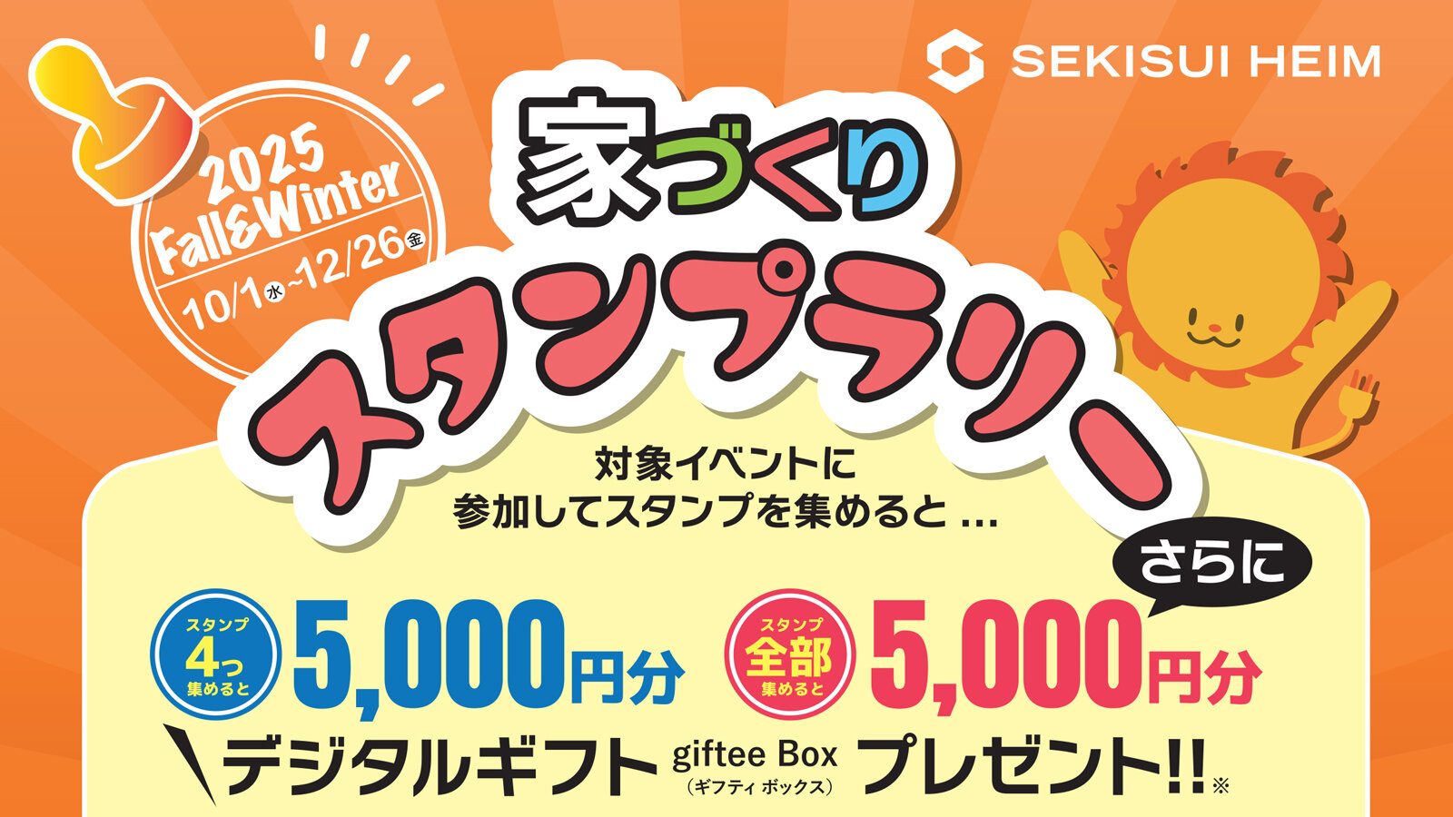 対象イベントに参加してスタンプを集めると、4つで5,000円分、5つ全部でさらに5,000円分のデジタルギフトをプレゼント!