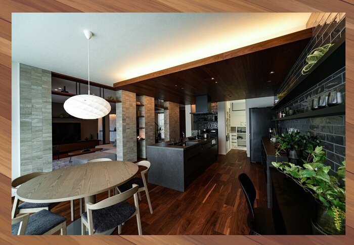 背面収納側の壁をダークトーンのタイルにすることで空間が引き締まり、高級感あるキッチンに。