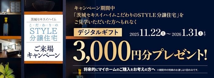 1月31日(土)までの期間限定で、事前予約の上、茨城セキスイハイムこだわりのSTYLE分譲住宅をご見学いただいたお客様にデジタルギフト3,000円分をプレゼントいたします✨✨