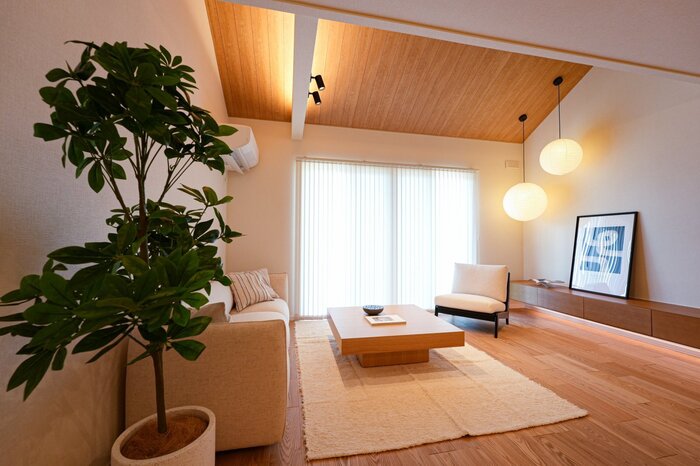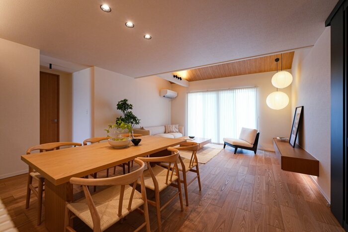 天井の木目アクセントや丸いペンダントライトが